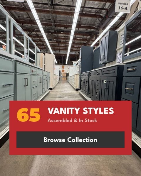 At Builders Surplus, our pre-assembled bathroom vanities come in over 65 different styles. These pair perfectly with medicine cabinets and linen cabinets, which can provide added storage. Our pre-built cabinets are available in a wide range of wood types, stains, and colors, so you can choose the best fit for your bathroom design.