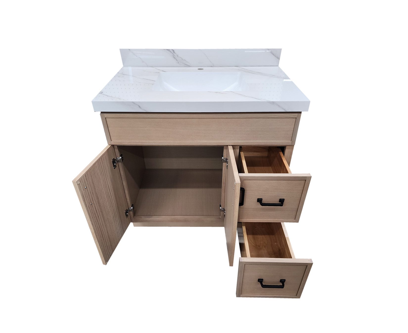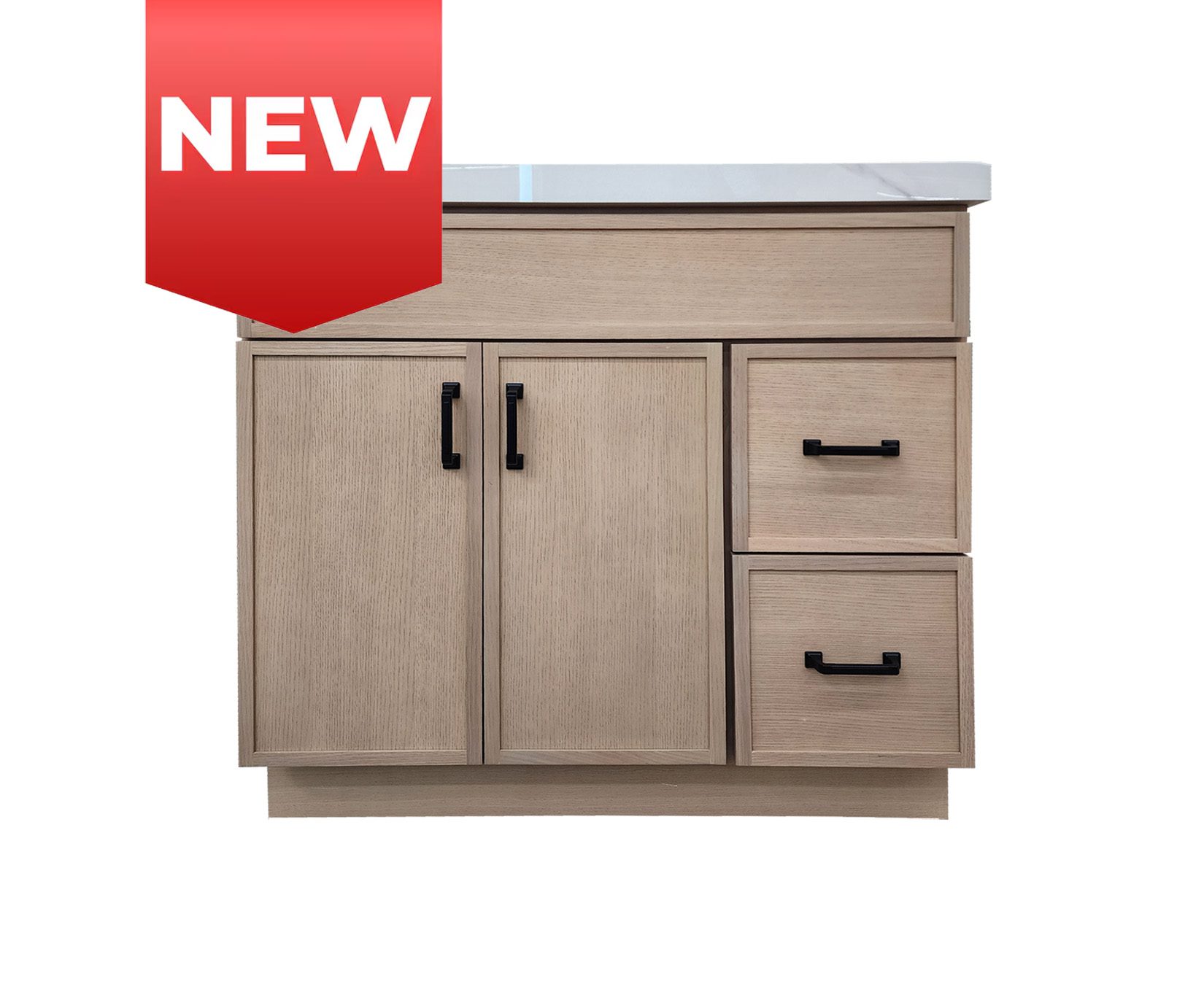 Complete your bathroom by adding an Aria Slim White Oak vanity with a sink thatโs designed to fit into any bathroom design scheme. At Builders Surplus Kitchen & Bath Cabinets, we bring you a variety of options to choose from so you can create the perfect space to start your day, as well as a room to relax whenever you need to. See our quality bathroom vanities and feel the exceptional finish before you buy your new cabinets at our fully-stocked showroom.