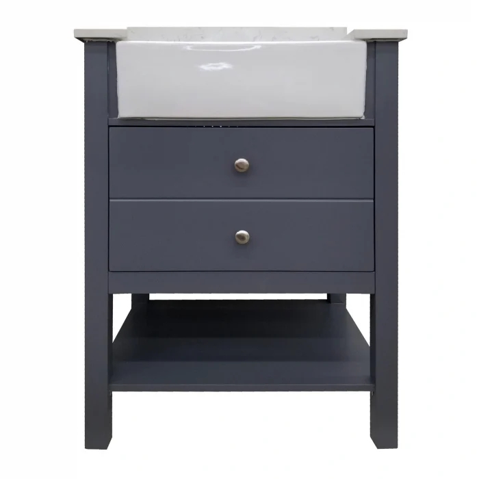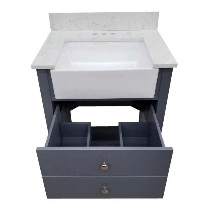 - Includes 4″ Drill Calcatta Engineered Marble Vanity Top w/ Farmhouse Sink